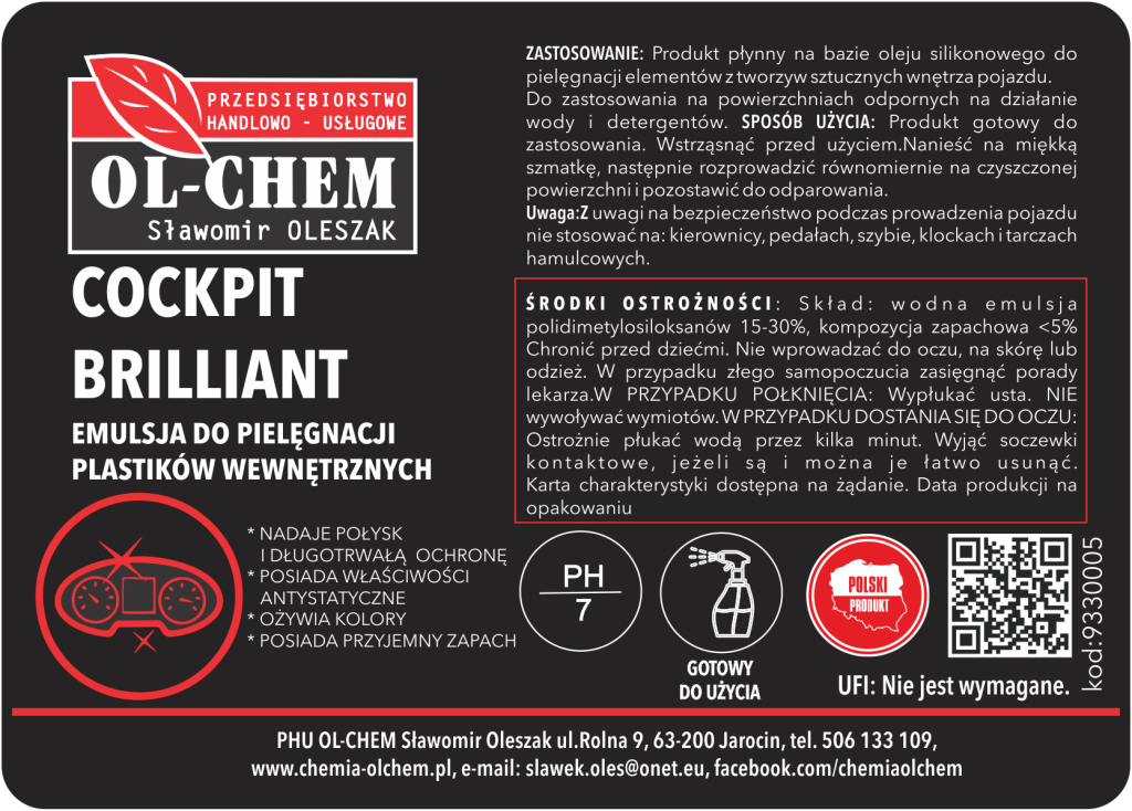 Produkt płynny na bazie oleju silikonowego do pielęgnacji elementów z tworzyw sztucznych wnętrza pojazdu.Do zastosowania na powierzchniach odpornych na działanie wody i detergentów.