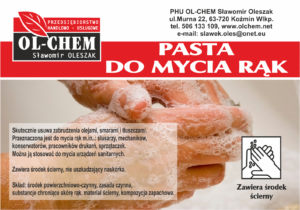 Pasta do mycia silnie zabrudzonych rąk, na bazie mączki drzewnej, stosowana w zakładach przemysłowych, warsztatach, kopalniach, lakierniach oraz przy różnego rodzaju pracach mechanicznych, hydraulicznych, itd |